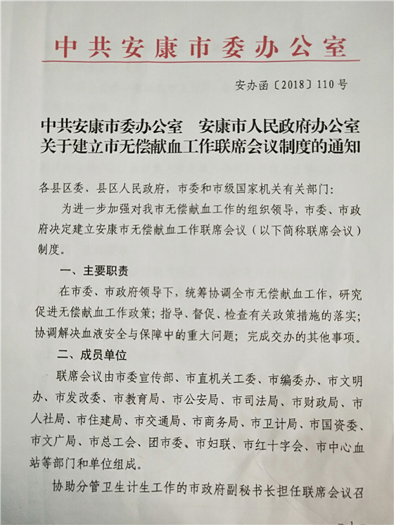 2、安康市率先在全省建立首個(gè)無(wú)償獻(xiàn)血聯(lián)系會(huì)議制度 安康無(wú)償獻(xiàn)血聯(lián)席會(huì)議制度是在安康市委、市政府領(lǐng)導(dǎo)下,由市委宣傳部等21個(gè)市級(jí)部門(mén)和單位組成,協(xié)助分管衛(wèi)生計(jì)生工作的市政府副秘書(shū)長(zhǎng)擔(dān)任聯(lián)席會(huì)議召集人。聯(lián)席會(huì)議每年召開(kāi)一次全體會(huì)議,主要職責(zé)為統(tǒng)籌協(xié)調(diào)全市無(wú)償獻(xiàn)血工作,研究促進(jìn)無(wú)償獻(xiàn)血工作相關(guān)政策,指導(dǎo)、督促、檢查有關(guān)政策措施的執(zhí)行落實(shí),協(xié)調(diào)解決血液安全與保障中的重大問(wèn)題。聯(lián)系會(huì)議制度的建立,標(biāo)志著我市無(wú)償獻(xiàn)血宣傳招募模式“政府主導(dǎo)、部門(mén)協(xié)作、社會(huì)參與、城鄉(xiāng)聯(lián)動(dòng)”的發(fā)展格局和長(zhǎng)效機(jī)制得到進(jìn)一步鞏固和提升。
