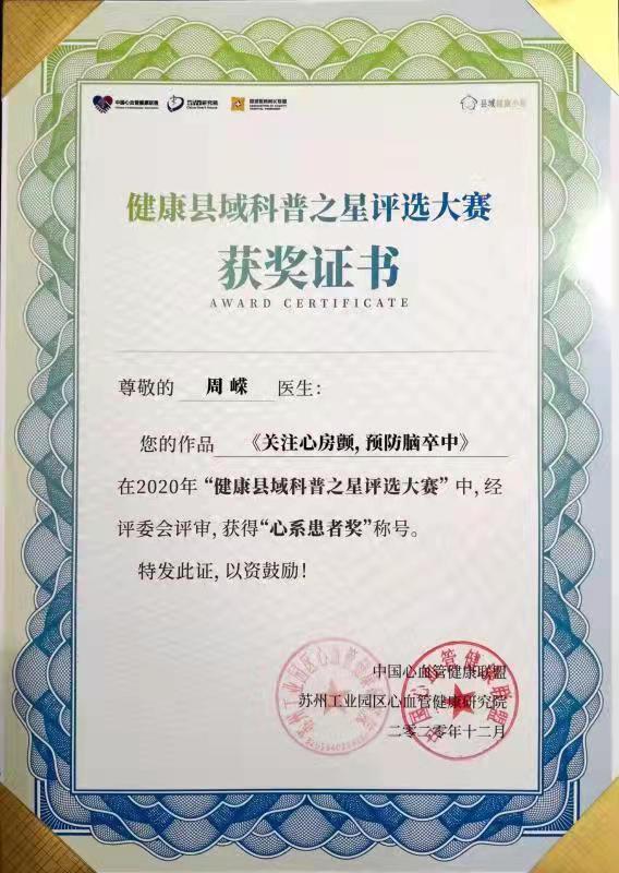 2020年 獲第二屆“互聯(lián)網+健康中國”科普大賽“科普達人獎”