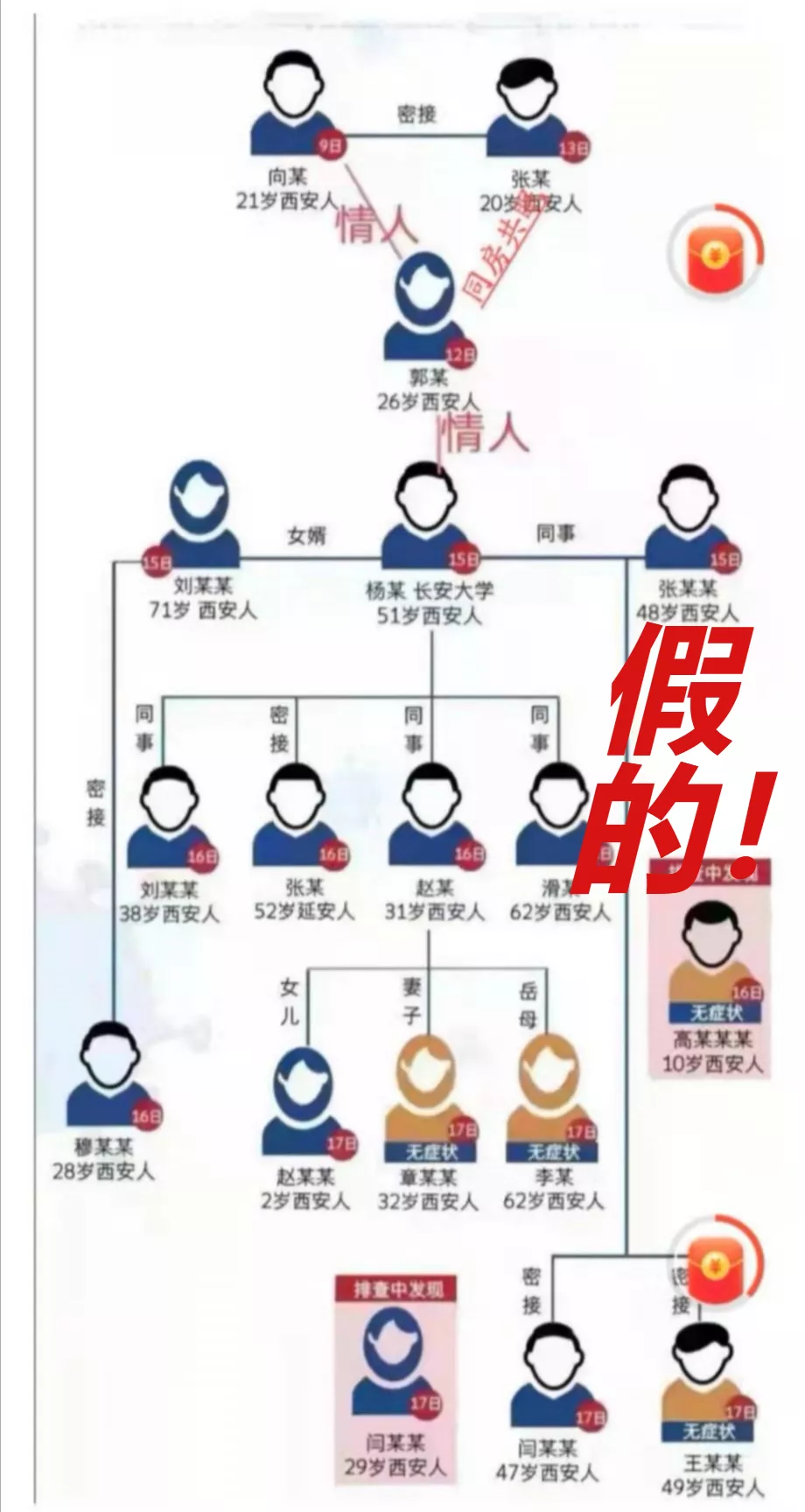 網(wǎng)上流傳一張確認(rèn)病例傳播鏈分解圖,在病例之間標(biāo)注“情人”關(guān)系,并傳言此次疫情傳播因素之一,是因?yàn)槲靼彩桌±c子牛門診的護(hù)士為情人關(guān)系,導(dǎo)致疫情擴(kuò)散,經(jīng)核實(shí),該圖盜用華商網(wǎng)12月18日制作的新聞作品圖片。該信息為虛假信息,造謠的人已被拘留。