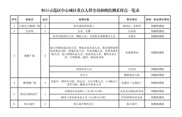 為防范新冠肺炎疫情輸入風(fēng)險(xiǎn),按照市政府和市疫情防控指揮部要求,恒口示范區(qū)疫情防控指揮部決定在恒口中心城區(qū)開(kāi)展重點(diǎn)人群新冠病毒全員免費(fèi)核酸檢測(cè)?,F(xiàn)將有關(guān)事項(xiàng)通告如下: