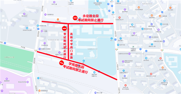 高新中學(xué)所處的學(xué)苑路東段、永定路全段、高新中學(xué)西側(cè)道路進行交通管制,禁止所有車輛通行。