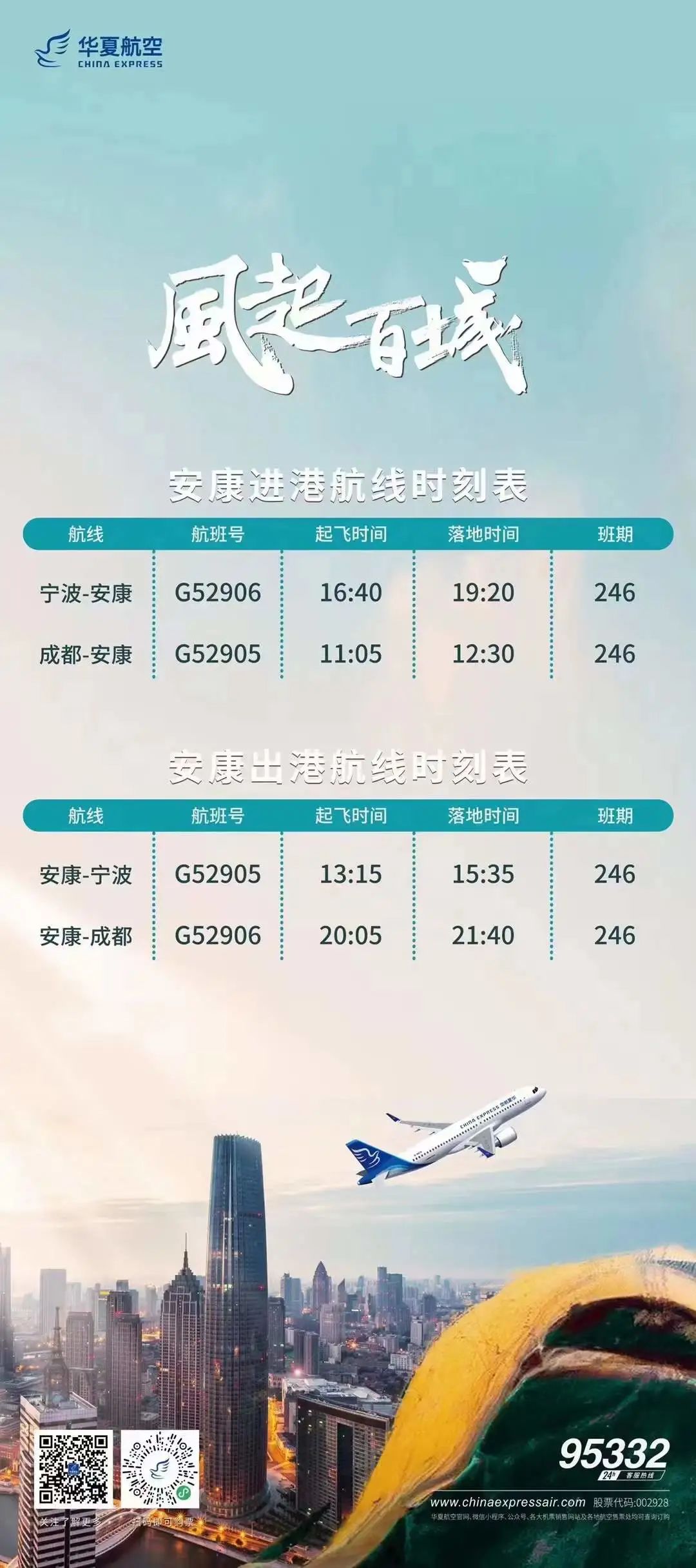8月2日,據(jù)安康富強(qiáng)機(jī)場(chǎng)消息,8月15日起,安康將開(kāi)通成都-安康-寧波航線,具體航班信息如下圖: