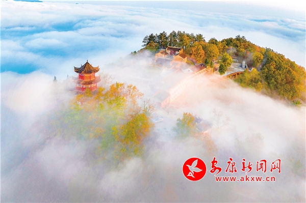 天柱山最美不過(guò)秋色,也是我在四季當(dāng)中頻繁上山的季節(jié)。每逢秋天,這里紅黃綠相間,漫山掛彩,在藍(lán)天的映襯下,多了幾分浪漫。從國(guó)道211起點(diǎn)的兩條上山公路,由數(shù)個(gè)“之”字連接起來(lái),從湖邊一直盤旋至山頂?shù)陌自乒潘?,遠(yuǎn)眺仿佛一個(gè)大大的“人”字形飄帶。雨后放晴的頭兩個(gè)早晨,在云霧的籠罩下,天柱山的下半身連同湖面一并被巨大的“蠶絲被”覆蓋,山的上半身或山頭浮在云海之上,像是茫茫大海上的一座孤島。