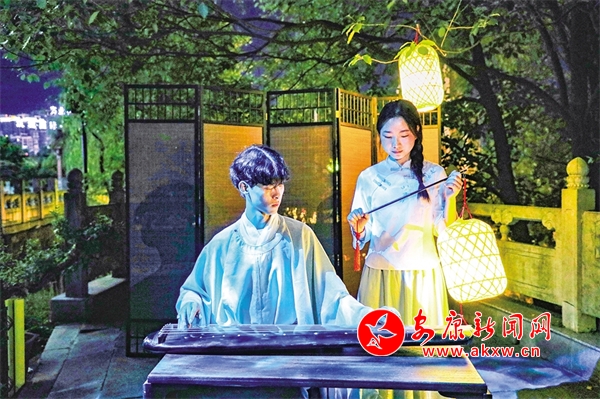 還未走近安瀾樓,就被一首琵琶曲改編的絲竹樂曲《春江花月夜》吸引,流暢多變的節(jié)奏,巧妙細膩的配器,絲絲入扣的演奏,仿佛將觀眾帶入那個月夜春江的迷人景色。環(huán)繞安瀾樓四周,畫家楊炳昌筆下的金州八景,仿佛一秒穿越古今,勝景徐徐、浮現腦際。