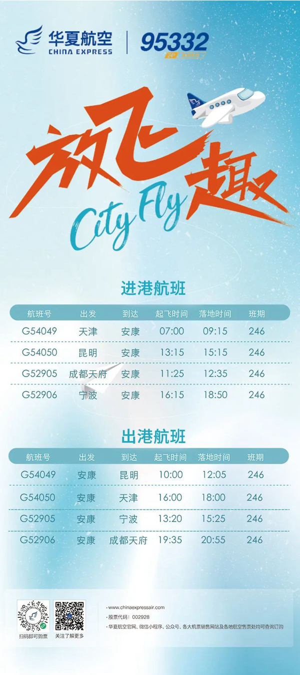 12月26日起,安康富強(qiáng)機(jī)場(chǎng)新增“安康=昆明”“安康=天津”航線。具體航線航班如圖: