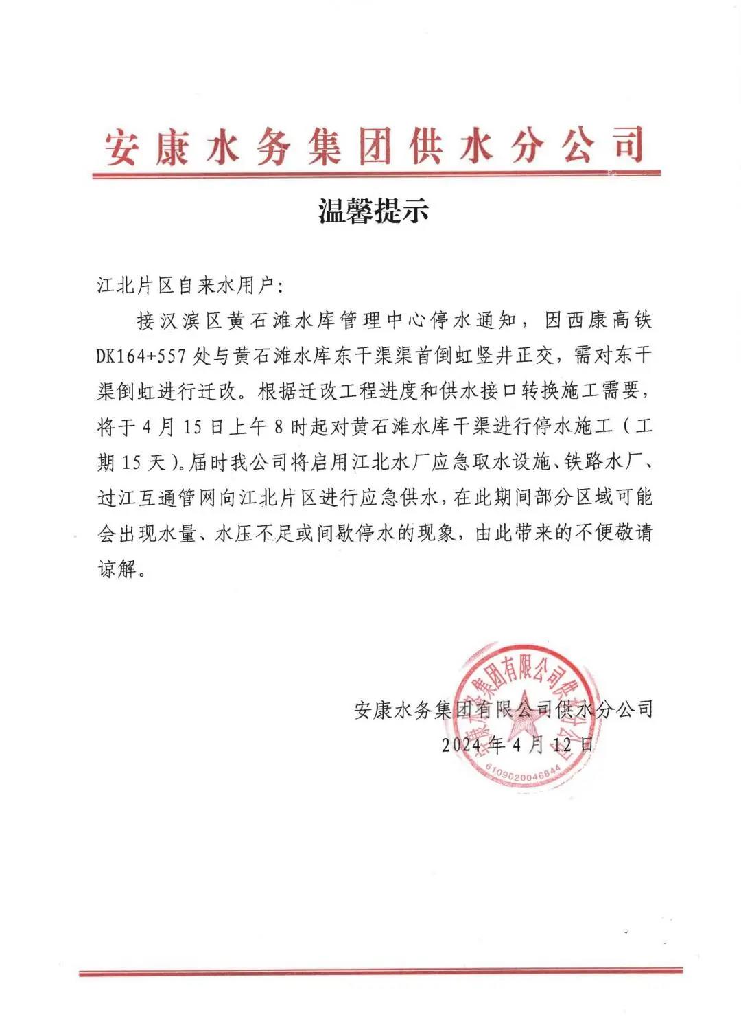 本網(wǎng)訊 4月12日,安康水務(wù)集團(tuán)有限公司供水分公司發(fā)布停水通知:因西康高鐵DK164+557處與黃石灘水庫東干渠渠首倒虹豎井正交,需對東干渠倒虹進(jìn)行遷改。根據(jù)遷改工程進(jìn)度和供水接口轉(zhuǎn)換施工需要,將于4月15日上午8時起對黃石灘水庫干渠進(jìn)行停水施工(工期15天)。