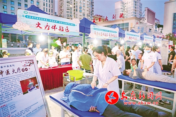 當晚,石泉縣中醫(yī)醫(yī)院在春潮廣場設(shè)置中醫(yī)健身操八段錦、中草藥科普、中藥養(yǎng)生茶免費飲用及展示、古法中藥香囊制作體驗、中醫(yī)護理適宜技術(shù)體驗、中醫(yī)體質(zhì)辨識與調(diào)養(yǎng)指導、健康咨詢等7個主題專區(qū),向市民展示中醫(yī)健身操、中草藥等,邀請市民飲用烏梅茶、美容養(yǎng)顏茶,體驗中藥香囊制作過程,向市民講解中草藥知識,為市民免費查體,提供健康咨詢和推拿、艾灸、刮痧、拔罐、火療等多種中醫(yī)療法服務,吸引了眾多市民體驗。