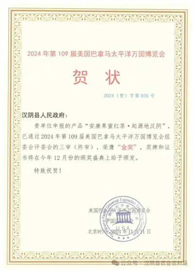 “安康果蜜紅·起源地漢陰”榮獲美國巴拿馬萬國博覽會(huì)金獎(jiǎng)