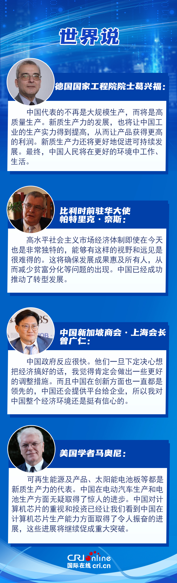 多位國(guó)際人士對(duì)中國(guó)經(jīng)濟(jì)發(fā)展充滿信心,高度肯定中國(guó)政府在經(jīng)濟(jì)發(fā)展中的核心引領(lǐng)作用,并對(duì)中國(guó)在高質(zhì)量生產(chǎn)及高精尖領(lǐng)域的創(chuàng)新領(lǐng)先地位表示贊賞。