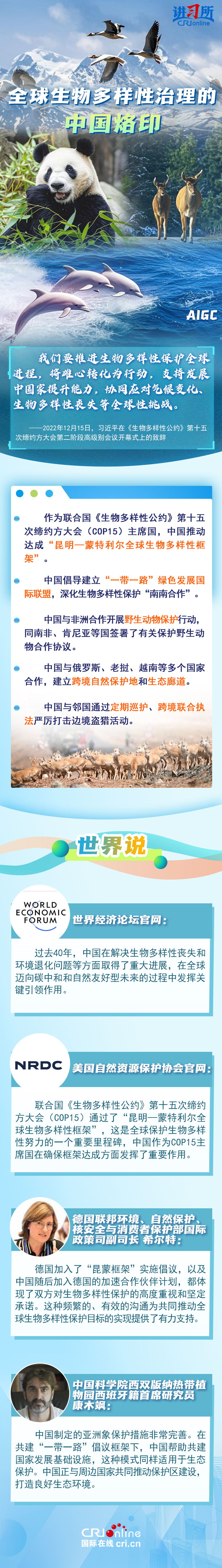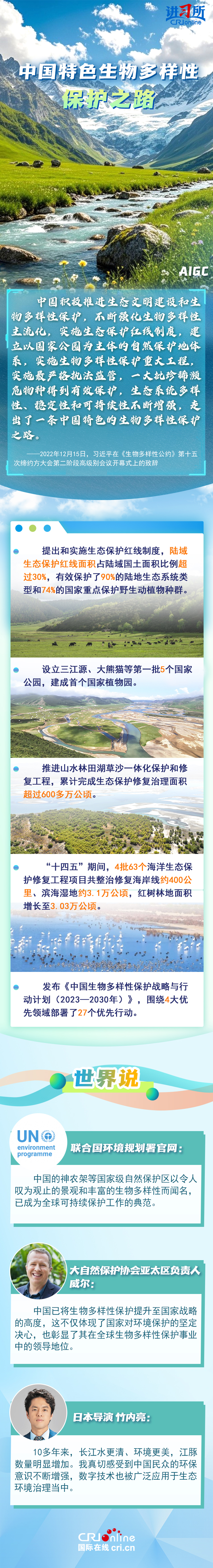 “心往一處想、勁往一處使,共建地球生命共同體?!弊鳛樽钤绾炇?、批準《生物多樣性公約》的締約方之一,生物多樣性保護已經(jīng)上升為中國的國家發(fā)展戰(zhàn)略。國際人士表示,中國的一系列舉措體現(xiàn)出對生態(tài)環(huán)境保護的堅定決心,同時,中國依托共建“一帶一路”倡議等國際合作機制,為推動全球生物多樣性保護提供了有力支持,在邁向自然友好型未來的過程中發(fā)揮關(guān)鍵的引領(lǐng)作用。