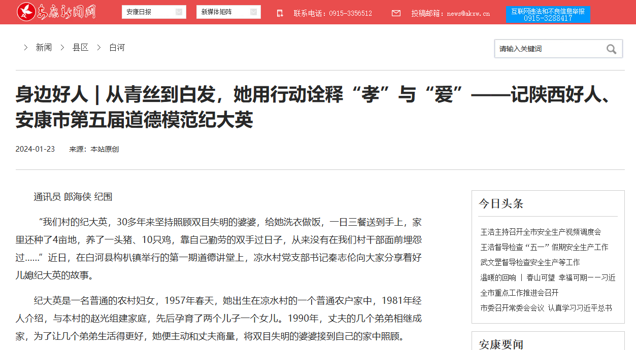 《身邊好人 | 從青絲到白發(fā),她用行動(dòng)詮釋“孝”與“愛(ài)”——記陜西好人、安康市第五屆道德模范紀(jì)大英》(2024-01-23發(fā)布)