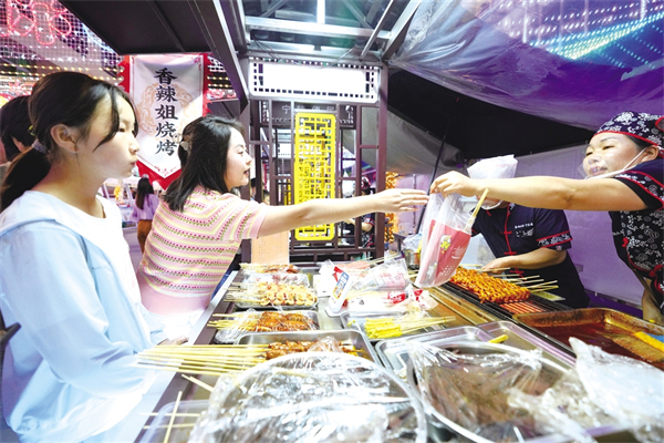 生態(tài)資源賦能場景體驗(yàn)。寧陜縣森林覆蓋率96.24%,居全國第一,負(fù)氧離子濃度超世衛(wèi)組織標(biāo)準(zhǔn)3倍,榮膺“中國天然氧吧”稱號(hào)?!按骞獯蟮馈被顒?dòng)深度嫁接生態(tài)優(yōu)勢,主打“21℃的夏天·清涼寧陜”體驗(yàn),將濱河公園舞臺(tái)與山林溪流自然聲景融合,夜間山風(fēng)伴隨演出的沉浸式場景獲游客好評(píng)。同步開設(shè)的“秦嶺山珍大集”“有好市小吃一條街”30余個(gè)展位展銷寧陜臘肉、羊肚菌、香菇;美食區(qū)現(xiàn)做洋芋糍粑、玉米鍋巴、麻辣豆腐干吸引游客頻頻駐足,形成“觀演+嘗鮮”閉環(huán)體驗(yàn)。