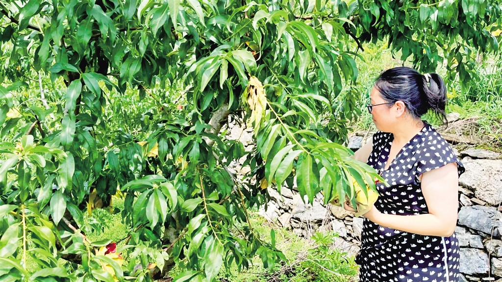 穿過村莊,山坡上500畝桃園綠意盎然。基地負(fù)責(zé)人伍娟與工人正采摘套袋?!?017年建設(shè)的桃園,今年雖受旱情影響,產(chǎn)量仍達(dá)30萬斤,產(chǎn)值約300萬元。”