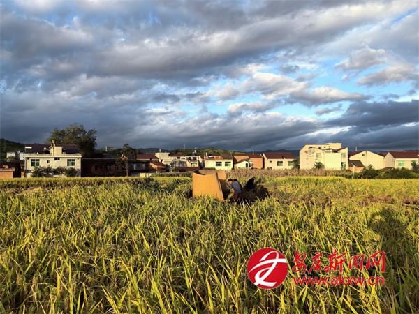走進新河村,陽光灑在沉甸甸的稻穗上,飽滿的谷粒泛著金黃光澤。微風(fēng)拂過,連片稻田掀起層層稻浪,裹挾著清新的谷物香氣彌漫田間。稻田里,農(nóng)機手熟練地操控著收割機,在田間來回穿梭,機身所過之處,水稻快速完成脫粒、秸稈分離,金黃的稻谷源源不斷送入機倉,實現(xiàn)顆粒歸倉;為進一步加快水稻收割進度,幾位村民則支起拌桶,手持稻把用力拍打,沿用傳統(tǒng)打谷技藝同步搶收,機器轟鳴聲、打谷聲與村民的歡聲笑語交織成秋日豐收的“協(xié)奏曲”。