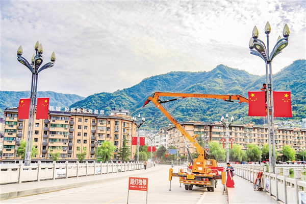 9月25日,紫陽縣城區(qū)橋溝路的大道上,工人正在懸掛國旗。?彭召伍 攝