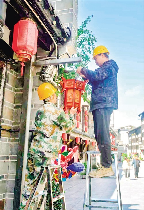 9月24日,石泉縣積極籌備國慶黃金周旅游服務保障工作。圖為石泉縣漢江古城景區(qū),工作人員正在更換景觀燈。?譚文昌 攝