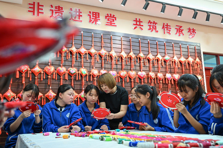 2025年9月26日,內(nèi)蒙古興安盟科右中旗巴彥呼舒第六中學(xué)美術(shù)教師、非遺代表性傳承人吳斯琴(左四)指導(dǎo)學(xué)生刺繡。近年來,內(nèi)蒙古興安盟科爾沁右翼中旗巴彥呼舒第六中學(xué)將當(dāng)?shù)貒壹壏沁z圖什業(yè)圖刺繡引入校園,開設(shè)校本課程,并成立興趣社團(tuán),在豐富校園文化生活的同時(shí),讓學(xué)生們近距離感受非遺的魅力,弘揚(yáng)和傳承中華優(yōu)秀傳統(tǒng)文化。