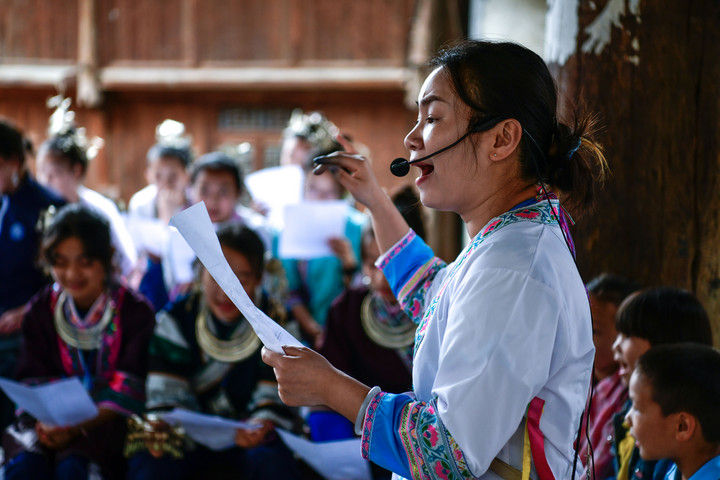 隨著國產(chǎn)動畫電影《哪吒之魔童鬧?!凡粩嗨⑿轮袊笆菲狈考o(jì)錄,參與電影配樂的貴州省榕江縣三寶侗寨的楊想妮和“舞樂蟬歌”團(tuán)隊(duì)為更多人所熟知。樂團(tuán)成員懷揣“用音樂傳遞侗族文化,讓世界聽見侗族大歌”的共同夢想,將侗族大歌推向更廣闊的舞臺。這是2025年4月22日,楊想妮在貴州省黎平縣肇興鎮(zhèn)廈格侗寨教前來研學(xué)的孩子們唱侗歌。