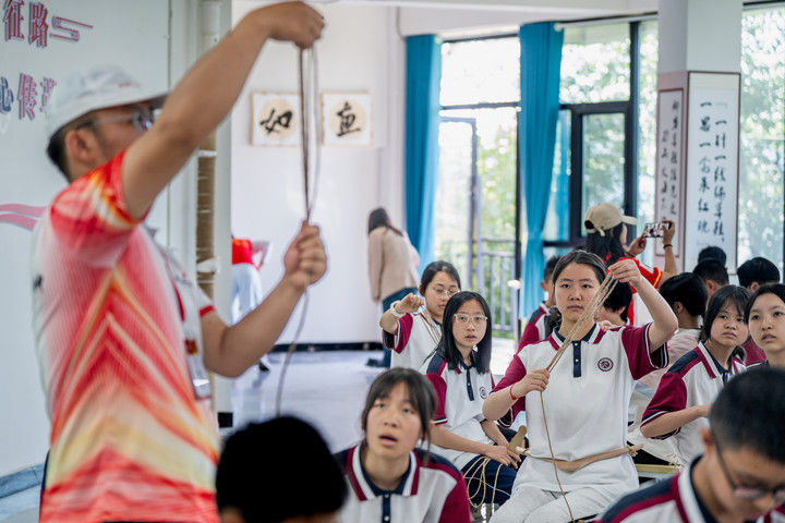 ? 2025年5月12日,云南省昭通市威信縣第一中學(xué)學(xué)生在大屏上紅色研學(xué)實(shí)踐基地體驗(yàn)編織草鞋。200余名學(xué)生在紅色研學(xué)實(shí)踐基地親手編織草鞋、制作蠟染,并參觀了扎西會議舊址、紅軍長征過云南情景體驗(yàn)館,在實(shí)踐互動中重溫紅色革命歷史。威信縣立足紅色文化資源優(yōu)勢,先后建成扎西會議紀(jì)念館、紅軍長征標(biāo)語館等紅色文化展館,以舊址遺跡為“教室”,以文物史料為“教材”,設(shè)計(jì)開發(fā)多門精品研學(xué)課程和線路,在深入開展紅色研學(xué)系列活動中傳承紅色基因。