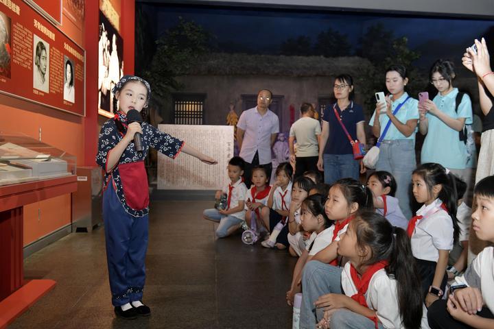 2025年8月7日,在山東省臨沂市沂蒙革命紀(jì)念館,沂蒙紅孩子文藝先鋒隊(duì)的房沫昕在講述紅色故事《沂蒙紅嫂祖秀蓮》。2024年9月,位于沂蒙革命老區(qū)的山東省臨沂市以“傳承沂蒙精神”為宗旨組建沂蒙紅孩子文藝先鋒隊(duì),通過歌舞、朗誦、故事講述、舞臺劇等紅色主題文藝節(jié)目,增強(qiáng)紅色文化感染力,不斷為紅色基因代代相傳注入新生力量。