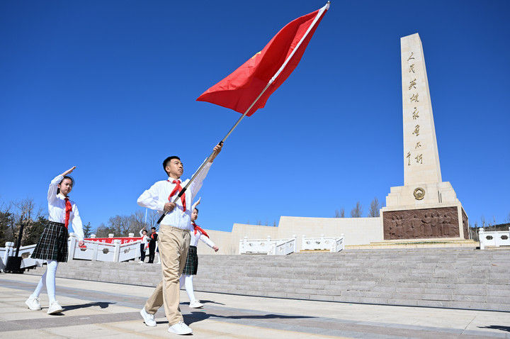 ? 這是2025年4月2日在內(nèi)蒙古呼和浩特市大青山紅色文化公園拍攝的中國少年先鋒隊(duì)出旗儀式。