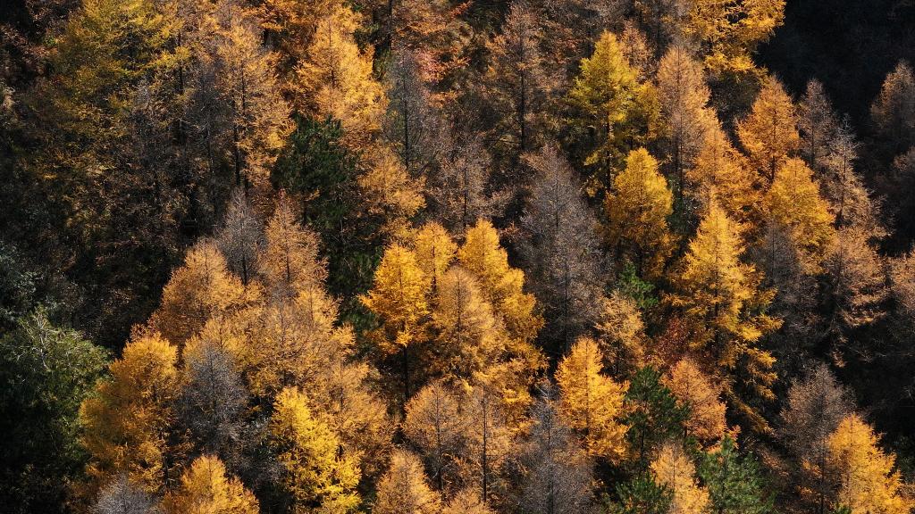 位于六盤山西麓的寧夏固原市西吉縣大寨山林場秋景(無人機照片)。新華社記者 楊植森 攝