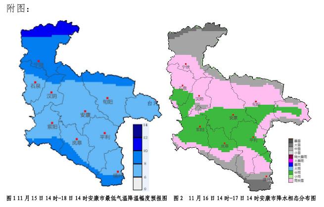 受冷空氣影響,15—17日全市過程日最低氣溫下降8~10℃,最低氣溫將出現(xiàn)在18日和19日清晨,全市大部會出現(xiàn)今冬初霜凍。預(yù)計(jì)最低氣溫:川道地區(qū)-4~2℃,中高山地區(qū)-8~-4℃,秦巴高山局地低于-8℃。16日夜間至17日白天我市大部有明顯吹風(fēng)天氣,陣風(fēng)可達(dá)5—6級。