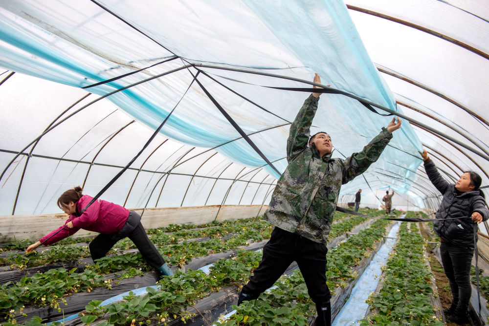 ??2023年12月15日,志愿者在浙江湖州長興縣水口鄉(xiāng)幫助農(nóng)戶加蓋大棚保溫膜。為應對強雨雪天氣,志愿者們幫助農(nóng)戶清理大棚上的積雪,加裝綁棚繩,棚內(nèi)增設立柱,提高大棚抗風雪能力,確保農(nóng)產(chǎn)品正常生產(chǎn)供應。