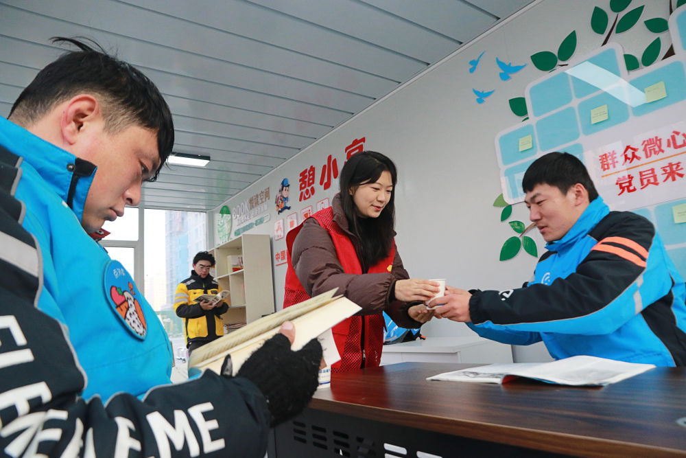 ??2023年12月27日,志愿者在山東省高密市密水街道“憩小亭”服務站為外賣騎手送上熱水。入冬以來,山東省高密市密水街道推進“憩小亭”暖心服務站建設,為外賣騎手、快遞小哥、網(wǎng)約車司機、環(huán)衛(wèi)工人等戶外勞動者提供飲水、無線上網(wǎng)、食物加熱等多項服務,讓他們感受到冬日里的溫暖。
