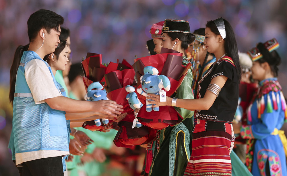 ??2024年11月30日,五十六個民族代表在海南三亞舉行的第十二屆全國少數(shù)民族傳統(tǒng)體育運動會閉幕式上為志愿者獻花。運動會期間,數(shù)千名志愿者“小鹿鹿”奔赴十余個競賽場館、二十多家接待酒店、媒體中心、機場車站等地,為來自全國各地的運動員、技術官員、工作人員和觀眾提供禮賓接待、交通引導、安全保衛(wèi)等志愿服務。