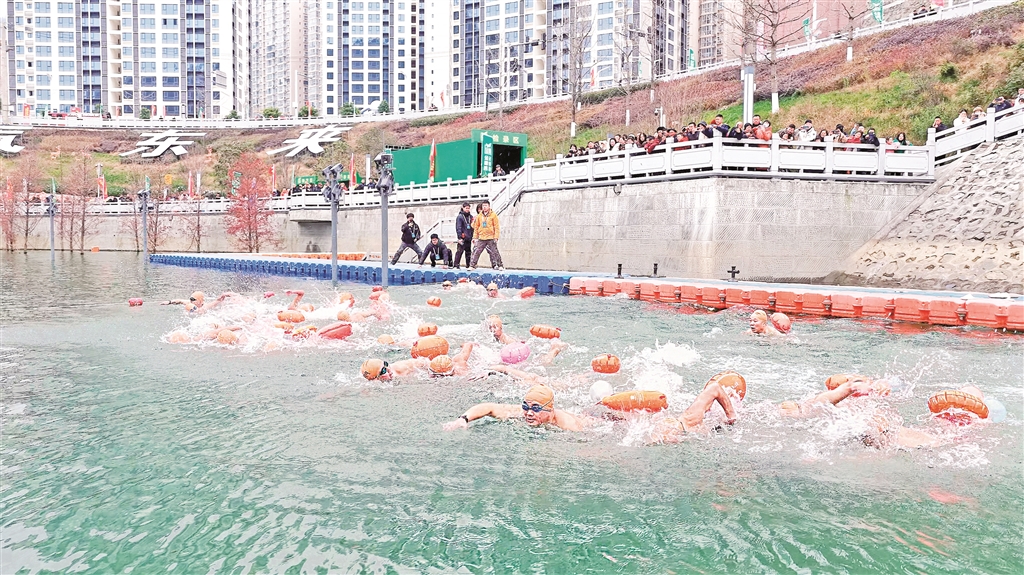 12月21日,陜西省第八屆漢江公開水域冬泳賽在紫陽縣月畔灣廣場水域舉行。當(dāng)天,來自陜西、湖北、四川、重慶、河南、內(nèi)蒙古自治區(qū)的44支代表隊(duì)400余名運(yùn)動(dòng)員報(bào)名參賽。(儲茂銀 攝)