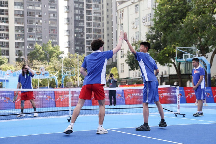 4月15日,在深圳市南山外國(guó)語(yǔ)學(xué)校(集團(tuán))高新中學(xué),中美學(xué)生結(jié)對(duì)進(jìn)行匹克球雙打比賽。新華社記者 梁旭 攝