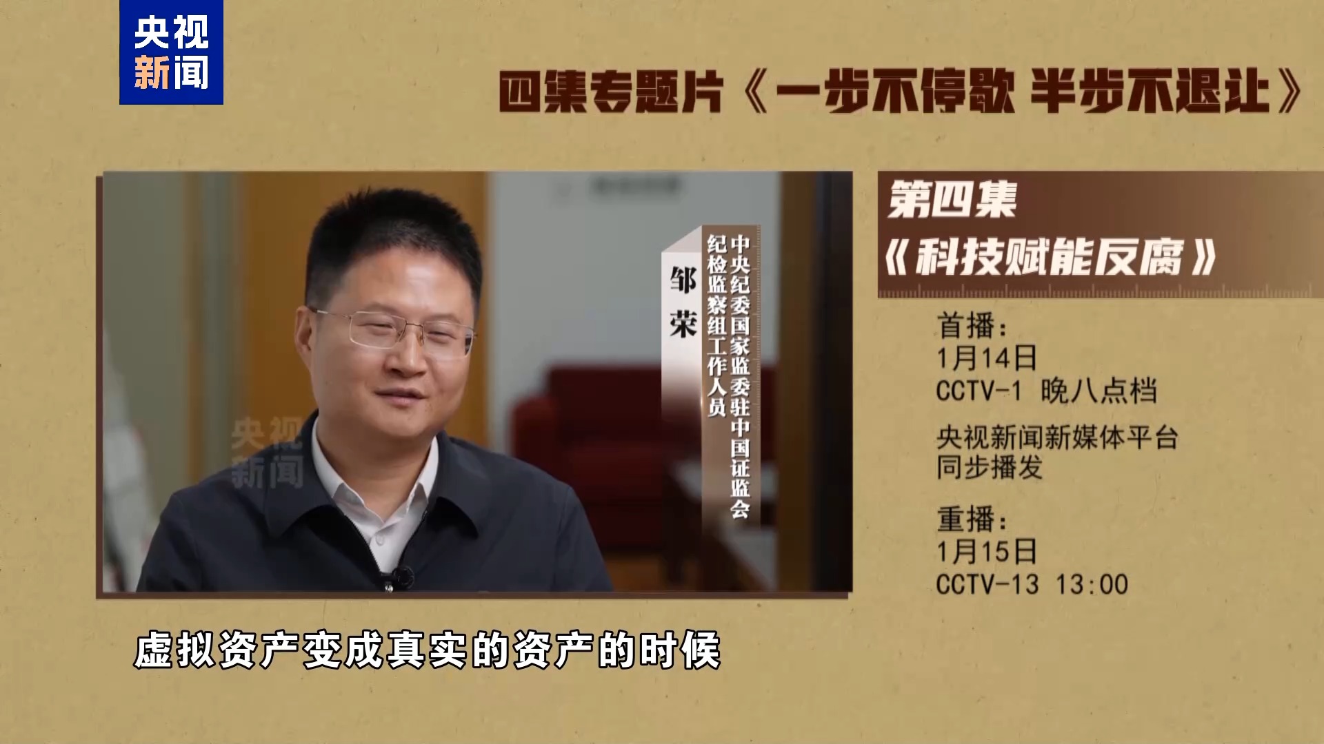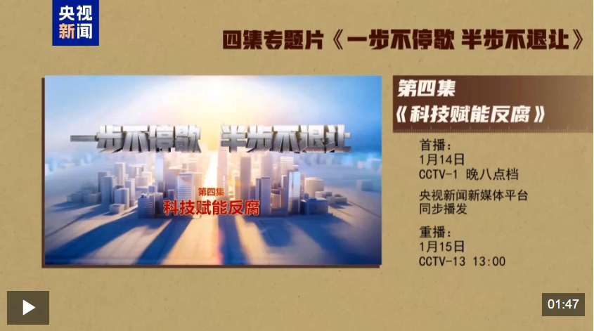 電視專題片《一步不停歇 半步不退讓》第四集《科技賦能反腐》,講述紀檢監(jiān)察機關(guān)豐富防治新型腐敗和隱性腐敗有效辦法,以信息化賦能正風反腐,充分運用科技手段精準發(fā)現(xiàn)不正之風和腐敗問題線索、迅速有效突破案件,著力提升智慧反腐、科技反腐水平。總臺央視綜合頻道1月14日晚8點檔播出,央視新聞新媒體平臺同步播發(fā)。