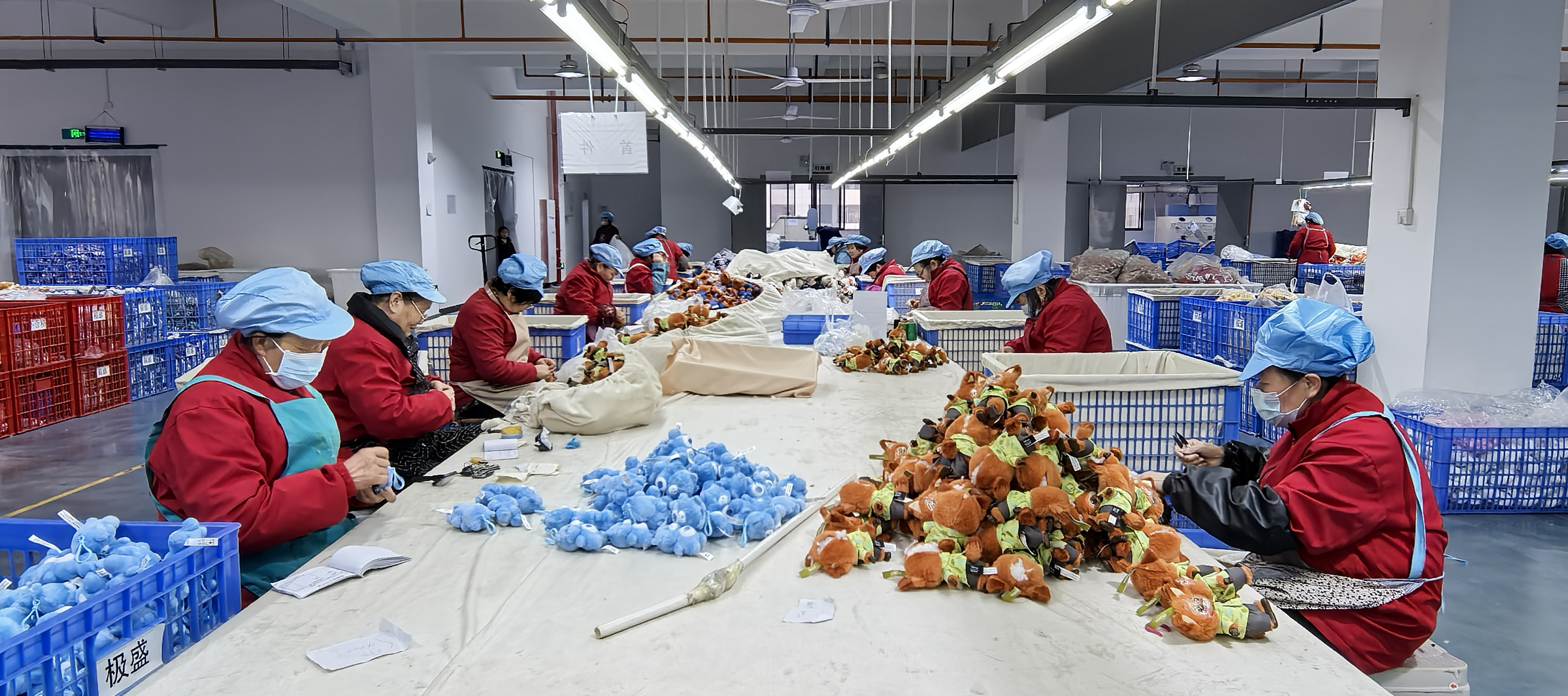 工人們正在制作熱門動漫IP毛絨玩具。