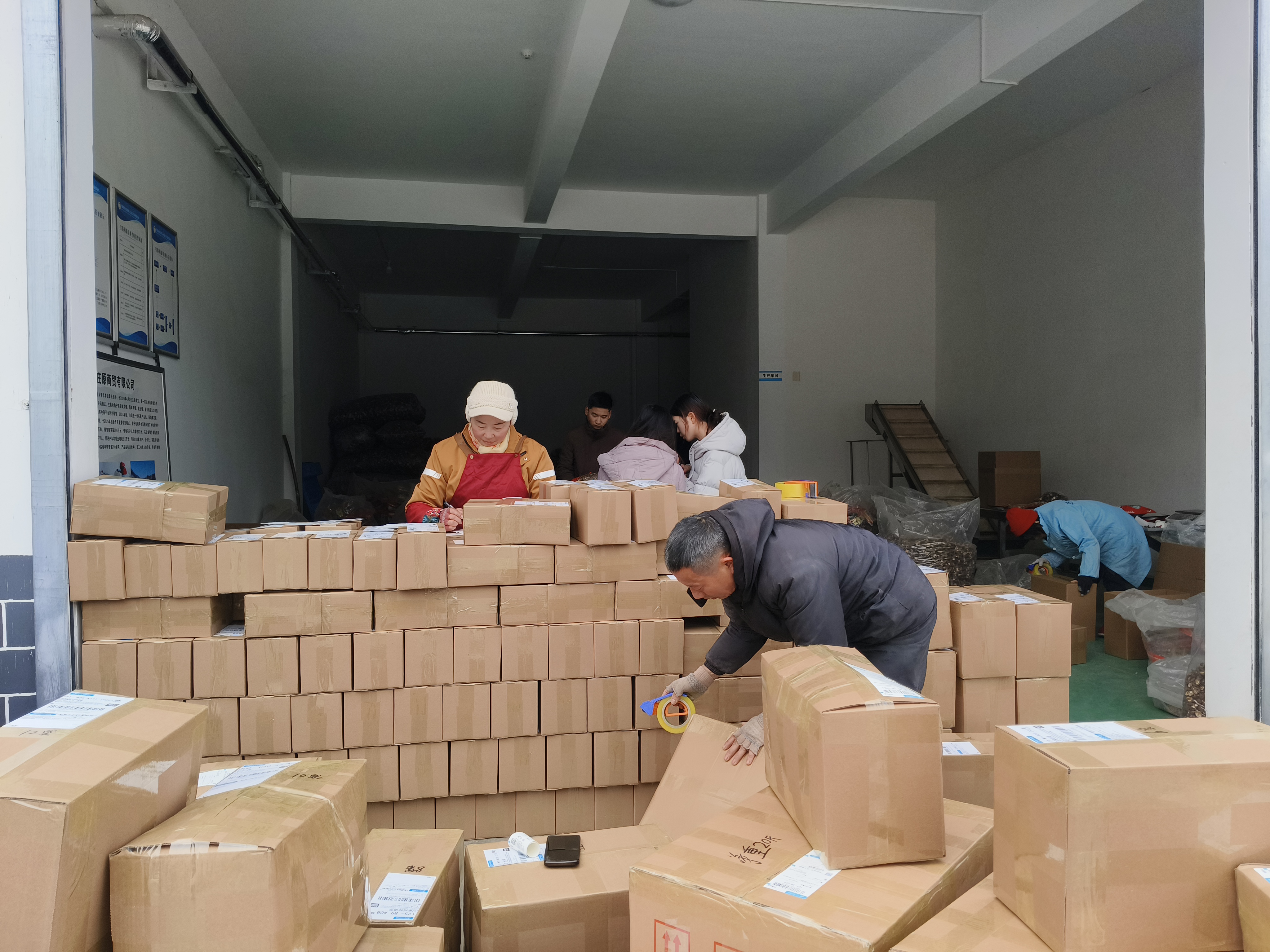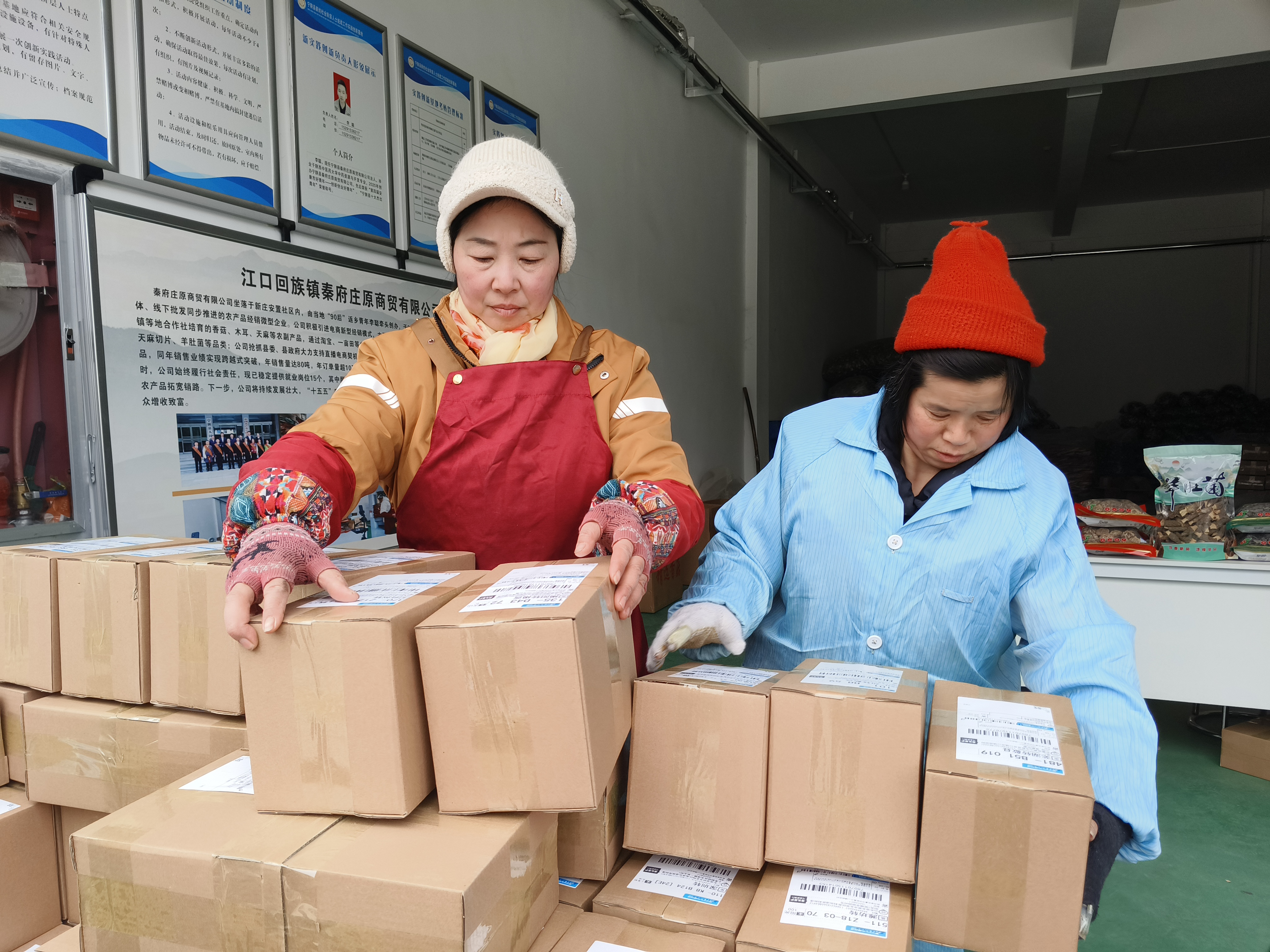 春節(jié)前夕,寧陜縣江口回族鎮(zhèn)秦府莊原商貿(mào)有限公司內(nèi)一片繁忙,工人們忙著打包、發(fā)貨。近期,寧陜山珍線上銷(xiāo)量持續(xù)走高,日均發(fā)貨約700單。(劉長(zhǎng)兵 攝)