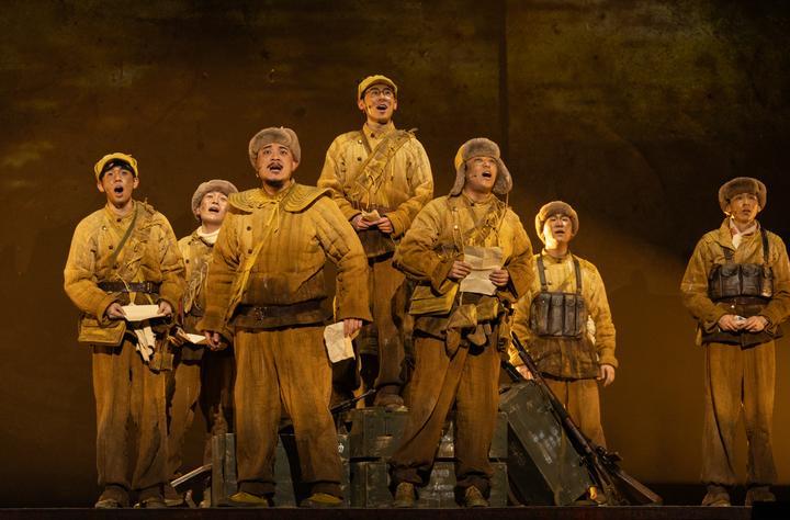 這是音樂劇《尋找李二狗》的演出劇照(2025年4月7日攝)。該劇以抗美援朝偉大歷史為背景,取材自志愿軍第39軍116師真實故事,通過當代青年常衛(wèi)國借助爺爺?shù)幕貞涗洿┰交?950年鴨綠江畔的舞臺設(shè)定,展開兩代青年的跨時空對話。2025年11月,該劇榮獲第十八屆文華劇目獎。