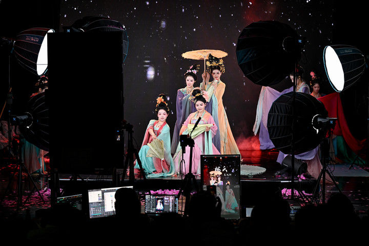 陜西省歌舞劇院的舞蹈演員在直播間進行“團播”表演(2025年12月25日攝)?!皥F播”這一多人演藝直播新形式,正成為專業(yè)文藝院團開辟線上“第二舞臺”、推動傳統(tǒng)文化創(chuàng)新表達的新嘗試?!柏Q屏化”“快節(jié)奏”的改編,讓傳統(tǒng)劇目受到越來越多年輕人喜愛。數(shù)據(jù)顯示,陜西省歌舞劇院“團播”單場最高曝光量超500萬,帶動線下票房增長約10%。