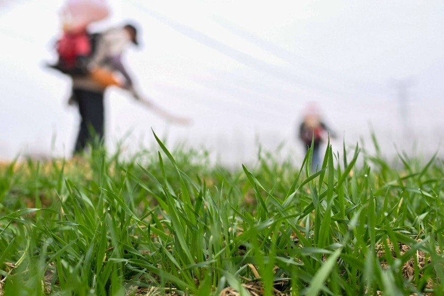 2026年2月4日,農民在江蘇省昆山市錦溪鎮(zhèn)長云村麥田間噴打化肥。新華社發(fā)(王須中攝)