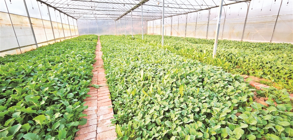 合作社大棚內(nèi)一排排硒滋圓二號油菜薹長勢喜人
