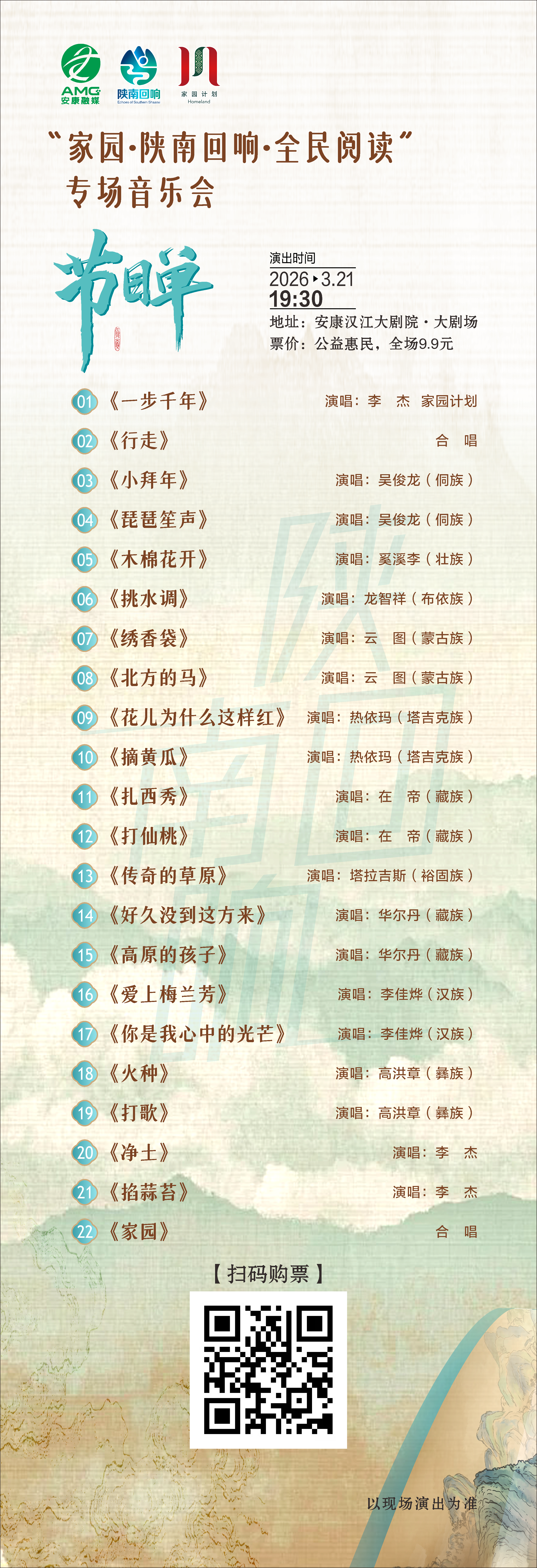今年2月1日,《全民閱讀促進(jìn)條例》正式施行,標(biāo)志著全民閱讀邁入法治化、規(guī)范化的發(fā)展新階段。條例明確指出,要鼓勵(lì)開展內(nèi)容健康、展現(xiàn)文化底蘊(yùn)、形式多樣的閱讀推廣活動(dòng)。在安康,閱讀不僅是靜默的文字,更可以是躍動(dòng)的音符、流淌的旋律。3月21日(周六)19:30,一場(chǎng)別開生面的“家園·陜南回響·全民閱讀”專場(chǎng)音樂會(huì)將在安康漢江大劇院大劇場(chǎng)拉開帷幕。這場(chǎng)由著名音樂人李杰領(lǐng)銜、匯聚九大民族藝術(shù)家的視聽盛宴,邀您共赴一場(chǎng)“用歌聲閱讀大地”的詩(shī)意之約。