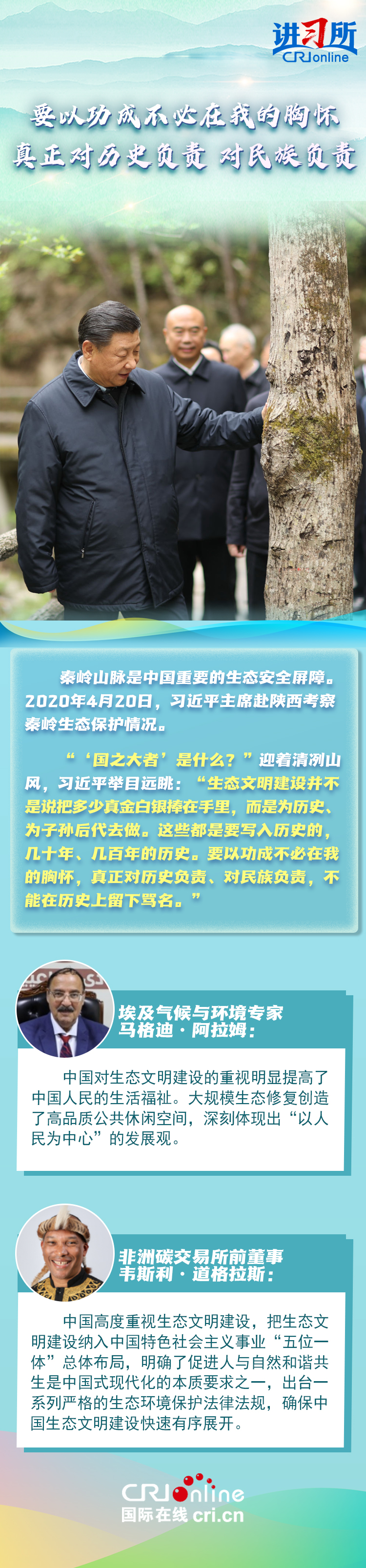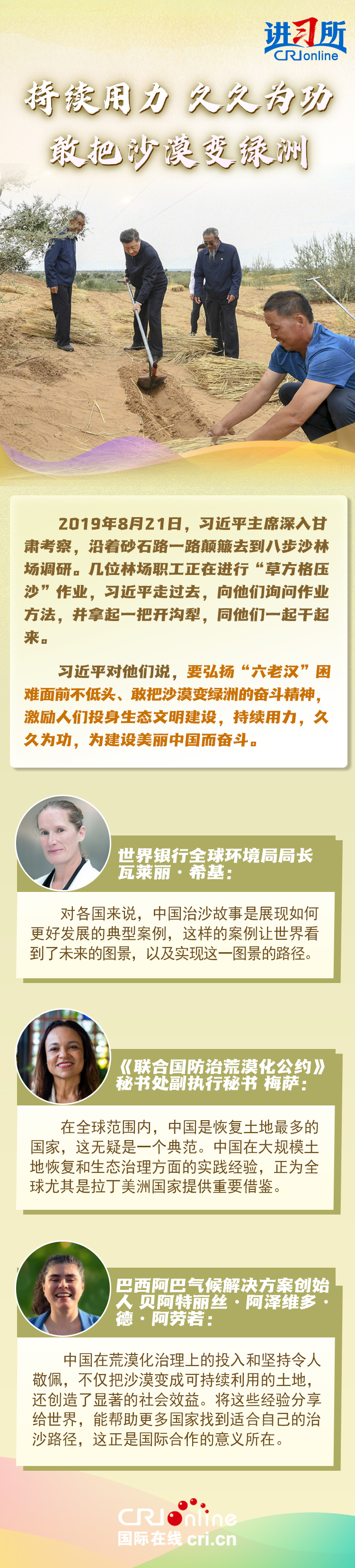 中共十八大以來,中國森林面積和蓄積量持續(xù)“雙增長”,荒漠化和沙化土地面積持續(xù)“雙縮減”,是全球增綠最多最快的國家。習(xí)近平主席始終身體力行:在北京連續(xù)14年參加首都義務(wù)植樹活動,在甘肅與林場職工一起進(jìn)行“草方格壓沙”作業(yè),在陜西親自“驗收”秦嶺生態(tài)保護(hù)……