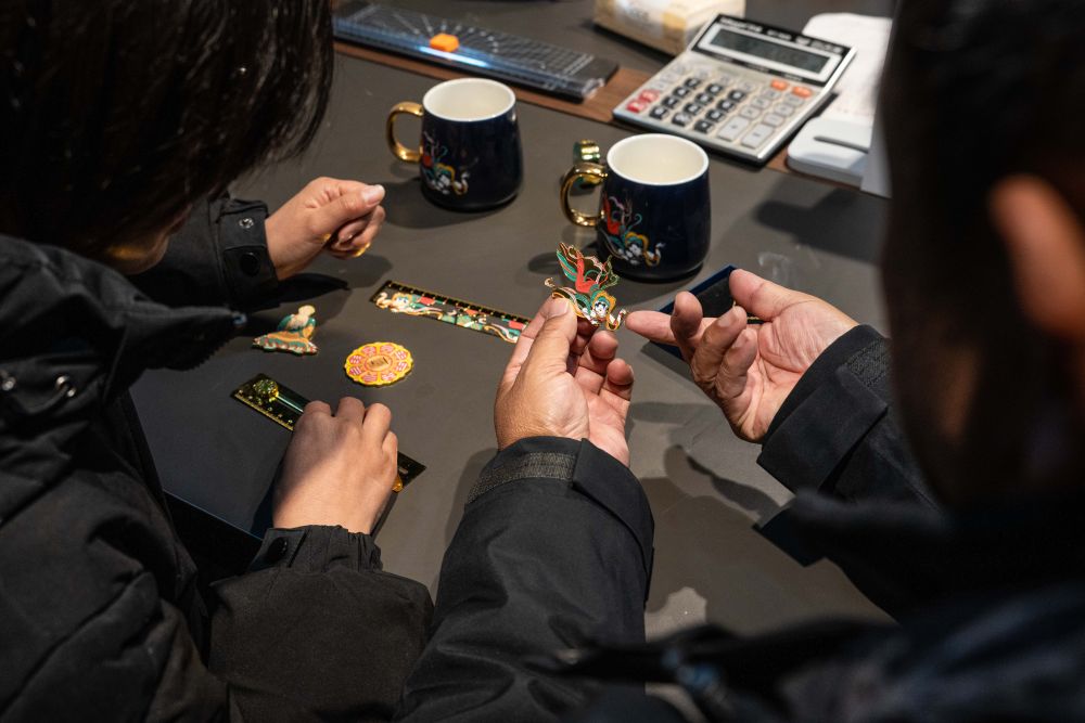 2026年1月15日,云南麗江白沙壁畫博物館館長楊志堅(右)與同事討論文創(chuàng)產品設計。近年來,白沙壁畫博物館持續(xù)推動白沙壁畫赴廣東、上海等地展覽,主持編纂畫冊,并推進數(shù)字化采集和文創(chuàng)開發(fā),讓壁畫藝術以新的形式走進人們的日常生活。