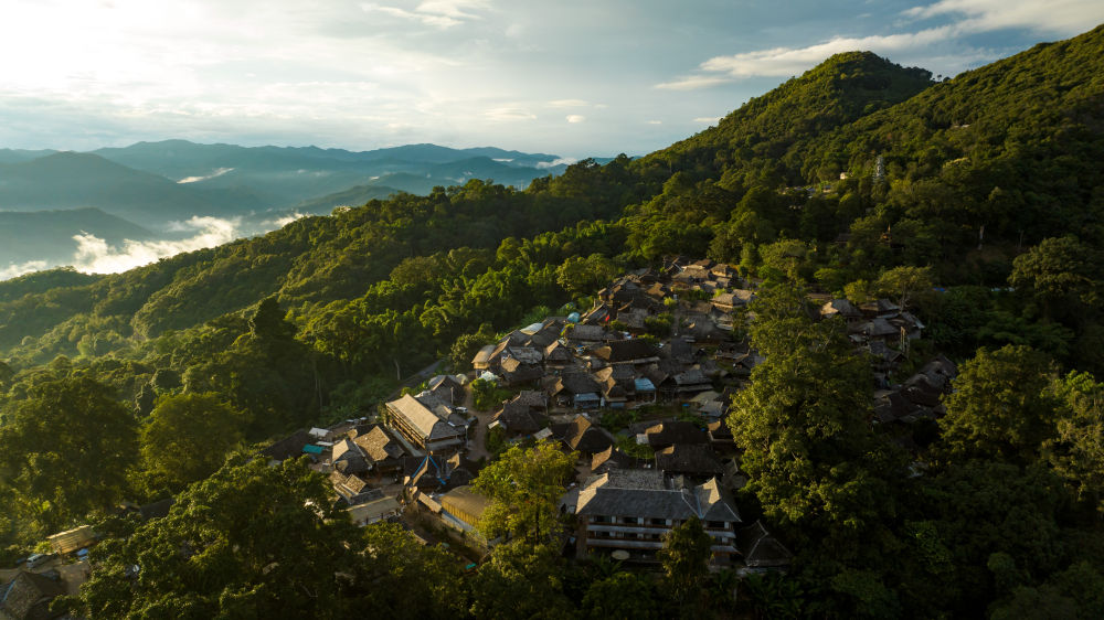 景邁山是云南普洱茶區(qū)最具標志意義的一座古茶山,其古茶林是世界上保存完整、面積較大、種植歷史悠久的人工栽培古茶林典型代表。2013年以來,當?shù)仃懤m(xù)實施村寨文物保護展示、消防防雷及古茶林監(jiān)測項目,優(yōu)先采用傳統(tǒng)工藝、傳統(tǒng)材料,延續(xù)傳統(tǒng)干欄式民居建筑結構、特征和風貌,并進行適應性改造和性能提升,在保護傳承遺產真實性、完整性的同時,推動遺產保護成果惠及當?shù)厝罕姟?023年9月,“普洱景邁山古茶林文化景觀”被列入《世界遺產名錄》,成為全球首個茶主題世界文化遺產。這是被山林與茶園環(huán)繞的云南景邁山翁基古寨一景(無人機照片,2023年9月18日攝)。
