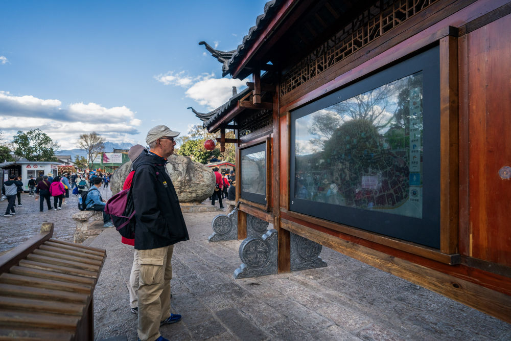 2024年3月23日,游客在麗江古城內查看電子導覽大屏。云南省麗江市近年充分應用5G、物聯(lián)網、大數(shù)據、人工智能等數(shù)字化技術,大力推動智慧旅游發(fā)展,提升服務水平和游玩體驗,為當?shù)匚穆卯a業(yè)發(fā)展注入新活力。