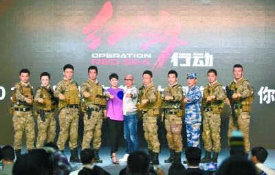 雖然同為軍事題材影片,但不同于《戰(zhàn)狼2》中的孤膽英雄,《紅海行動》中的地面行動主要由一支蛟龍突擊隊完成,這支突擊隊由8人組成,分別由張譯、杜江、黃景瑜、蔣璐霞、尹昉、郭家豪、王雨甜和麥亨利扮演,昨天他們也身著迷彩服和裝備亮相,軍姿颯爽,F場,張譯儼然變成海軍的“迷弟”,大呼“中國的軍艦好大啊,那個不是我們普通的老百姓能感受得到的,只有你真正看到的時候,你才會發(fā)現我們中國海軍的力量越來越強大了。在這樣的軍艦保護之下,會覺得很安全。”海清也在片中出演了一名女記者,并被于冬調侃為“海大膽兒”:“開拍前我們居然在中國找不到女一號,大家想得到的當紅明星都很忙,聽說是林超賢的戲都覺得好,但一聽去摩洛哥這么久,看看地圖她們都怕了,只有我們海清,一聽說就馬上跟劇組報到。我特別感動!