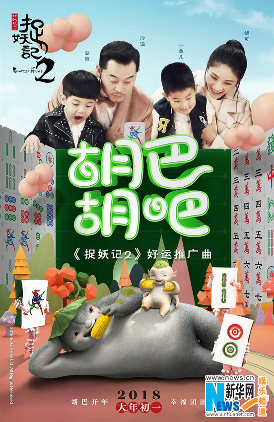 1月8日胡可在微博發(fā)文,表示很開心和春節(jié)檔合家歡巨制《捉妖記2》合作,演唱好運(yùn)推廣曲《胡巴胡吧》,并發(fā)布了安吉和小魚兒坐在導(dǎo)演席上認(rèn)真監(jiān)工的照片。9日,由“最火一家人”——沙溢、胡可夫婦和兩位萌娃溫情獻(xiàn)唱的好運(yùn)推廣曲《胡巴胡吧》音頻和MV拍攝花絮照片曝光,一家四口的演唱充滿了溫馨和愛意,MV拍攝過程中和胡巴、笨笨的“熱舞”更是歡樂十足,帶來了美好的新年祝福和開年好運(yùn)氣。