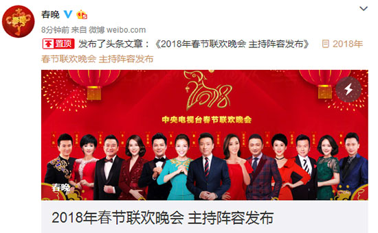 文章稱,2018年春節(jié)聯(lián)歡晚會籌備已進入倒計時階段。伴隨著節(jié)目打磨日臻完善,排練合成逐步成熟,演出陣容也逐漸浮出水面。首批公布的參演人員,就是備受關(guān)注的主持人陣容。今年,春晚將繼續(xù)延用“北京主會場+各地分會場”的直播模式,主會場設(shè)5位主持人,分會場8位主持人,在除夕夜陪伴全球觀眾共度佳節(jié)。