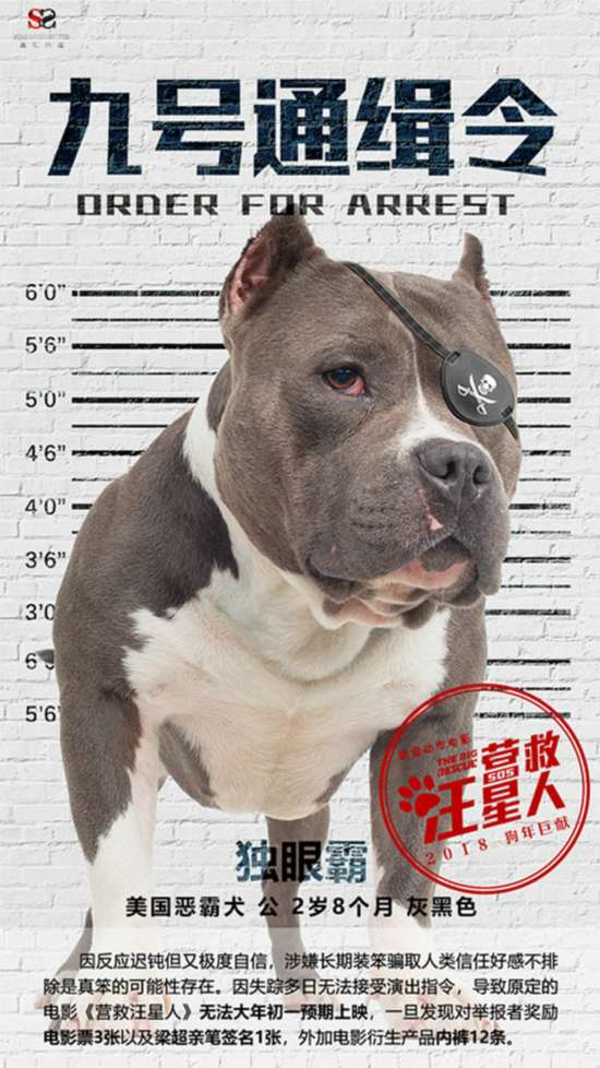 此外,萌寵動作電影《營救汪星人》今天重磅推出一系列創(chuàng)意海報。首款和大家見面“通緝犯”海報自然由主演“大雄”撐場。從曝光的畫面看,溫順的拉布拉多的大雄搖身一變成了“刀疤臉”,身后是香港警匪電影通緝重犯時常用的背景板,氣氛一片肅殺。通緝內(nèi)容如下:“刀疤雄,純種拉布拉多,公,2歲7個月,奶茶色。因過度善解人意警覺性較高,涉嫌假裝聰明,導(dǎo)致人見人愛,智商排行榜有可疑跡象。因失蹤多日無法接受排練計劃,導(dǎo)致原定的電影《營救汪星人》無法大年初一預(yù)期上映。一旦發(fā)現(xiàn)對舉報者……”