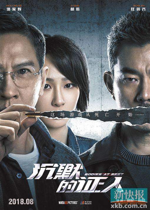 海報(bào)中,張家輝、楊紫肅立海報(bào)一側(cè),而任賢齊站在另一側(cè),似乎暗示了電影中的人物關(guān)系。橫穿海報(bào)的子彈軌跡正好擋住三人的口部,與片名“沉默的”證人相照應(yīng)。