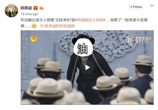 4月4日,陳思誠在微博發(fā)布了一支電視劇《遠(yuǎn)大前程》片段。視頻中,陳思誠全程被各種表情包遮臉,在眾人“驚嚇”、“辣眼睛”、“嫌棄”的氛圍中,跟倪大紅、劉奕君、果靖霖三位老戲骨對戲。